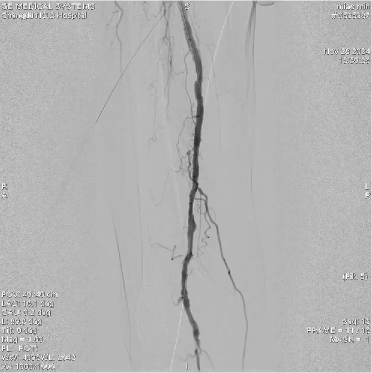 輔助檢查:下肢CTA示雙下肢股淺動脈大量鈣化斑塊形成,右側股淺動脈中下段及腘動脈多發狹窄合并短段閉塞,膝下脛前動脈閉塞,腓動脈及脛后動脈血流通暢。
