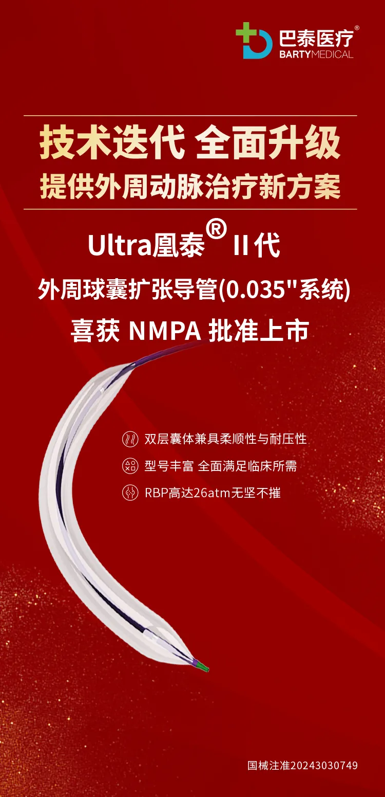 近日,浙江巴泰醫療科技有限公司(以下簡稱“巴泰醫療”)自主研發的Ultra凰泰?Ⅱ代外周球囊擴張導管(0.035″系統)(國械注準20243030749)獲國家藥品監督管理局(NMPA)批準上市。這標志著巴泰醫療布局外周動脈疾病介入治療整體解決方案再次取得關鍵進展,顯示了巴泰醫療在外周介入領域強勁的產品研發實力。