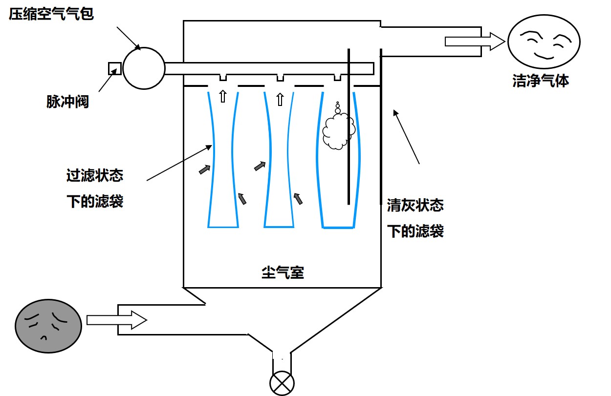 脈沖噴吹袋式除塵器是當(dāng)含塵氣體由進(jìn)風(fēng)口進(jìn)入除塵器,首先碰到進(jìn)出風(fēng)口中間的斜板及擋板,氣流便轉(zhuǎn)向流入灰斗,同時(shí)氣流速度放慢,由于慣性作用,使氣體中粗顆粒粉塵直接流入灰斗。起預(yù)收塵的作用,進(jìn)入灰斗的氣流隨后折而向上通過內(nèi)部裝有金屬骨架的濾袋粉塵被捕集在濾袋的外表面,凈化后的氣體進(jìn)入濾袋室上部清潔室,匯集到出風(fēng)口排出,含塵氣體通過濾袋凈化的過程中,隨著時(shí)間的增加而積附在濾袋上的粉塵越來越多,增加濾袋阻力,致使處理風(fēng)量逐漸減少,為正常工作,要控制阻力在一定范圍內(nèi),必須對濾袋進(jìn)行清灰,清灰時(shí)由脈沖控制儀順序觸發(fā)各控制閥開啟脈沖閥,氣包內(nèi)的壓縮空氣由噴吹管各孔經(jīng)文氏管噴射到各相應(yīng)的濾袋內(nèi),濾袋瞬間急劇膨脹,使積附在濾袋表面的粉塵脫落,濾袋得到再生。清下粉塵落入灰斗,經(jīng)排灰系統(tǒng)排出機(jī)體。由此使積附在濾袋上的粉塵周期地脈沖噴吹清灰,使凈化氣體正常通過,保證除塵系統(tǒng)運(yùn)行。